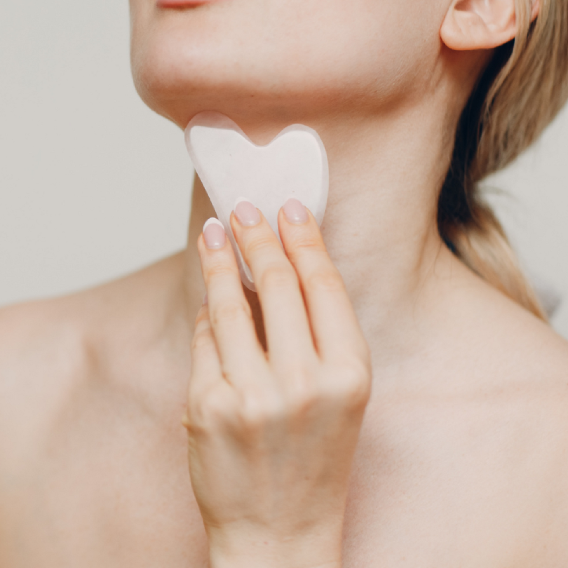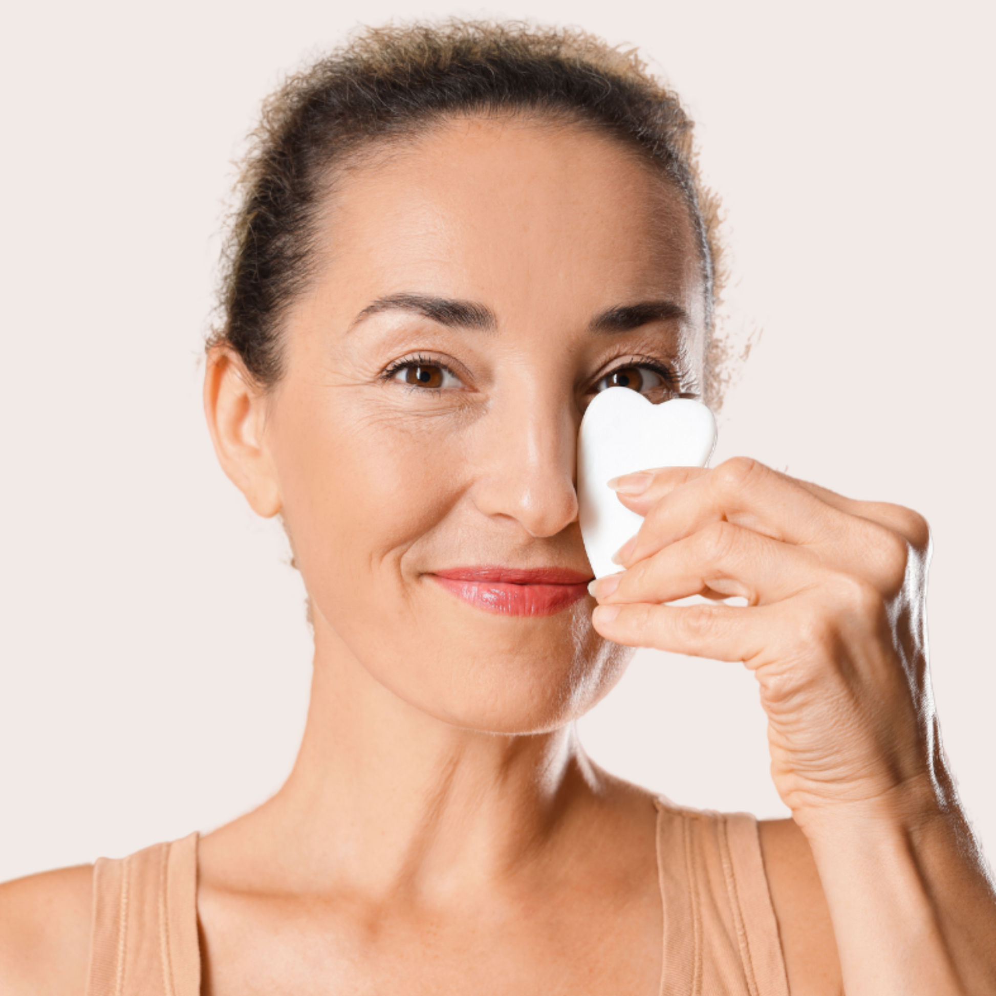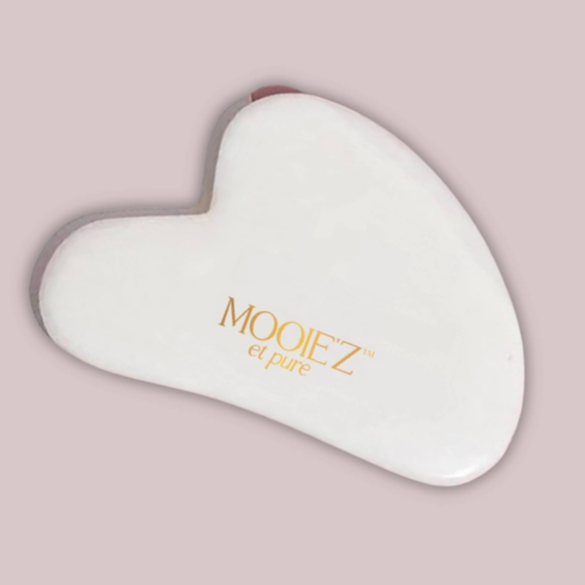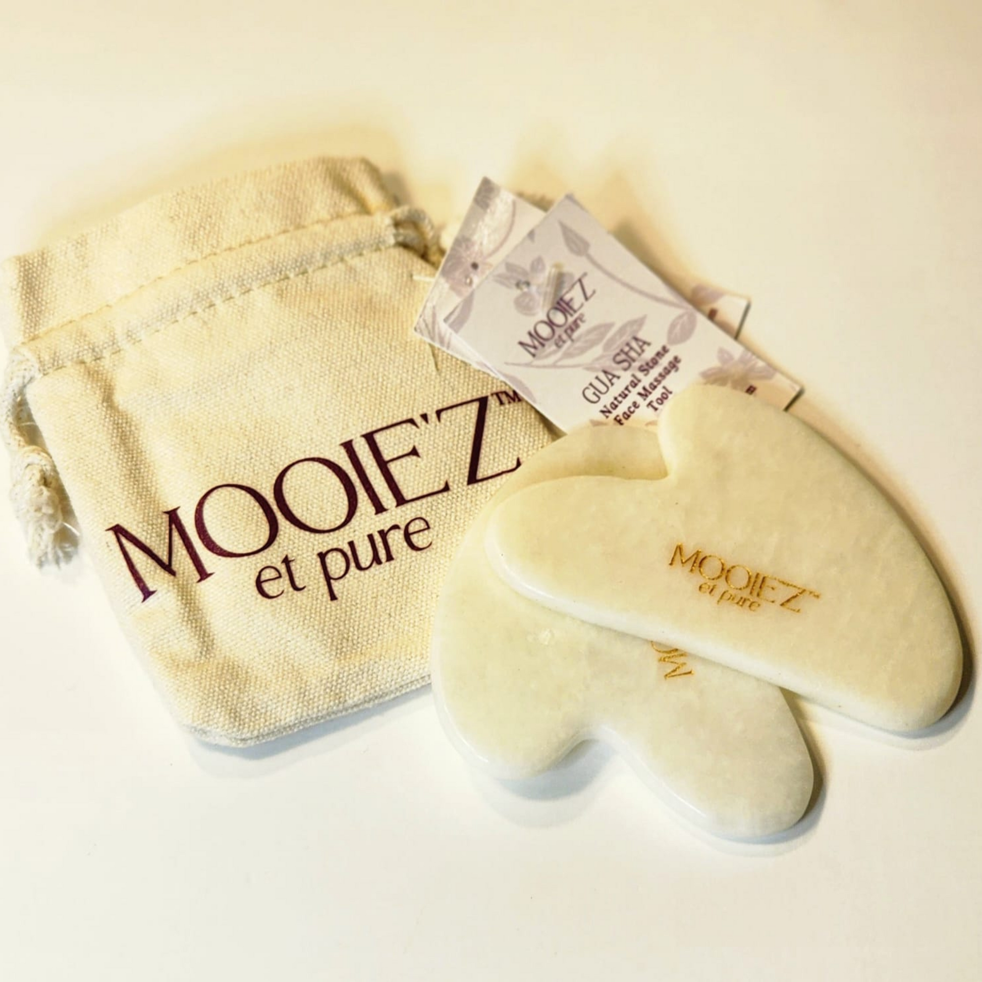 Facial massage tool that helps to lift, tone, and rejuvenate facial muscles. Made from natural jade stone, our Gua-Sha face massage tool is specially designed to help improve circulation, reduce puffiness, and promote a glowing complexion. This soothing tool aids in lymphatic drainage and relieves facial tension, for a more toned and revitalized appearance enhancing natural radiance. Gua Sha massage is a natural technique that helps to lift, tone, and rejuvenate your face. Incorporate this soothing ritual into your daily routine for a glowing, youthful complexion. Regular use of Gua Sha can enhance skin texture, tone, and overall complexion.
